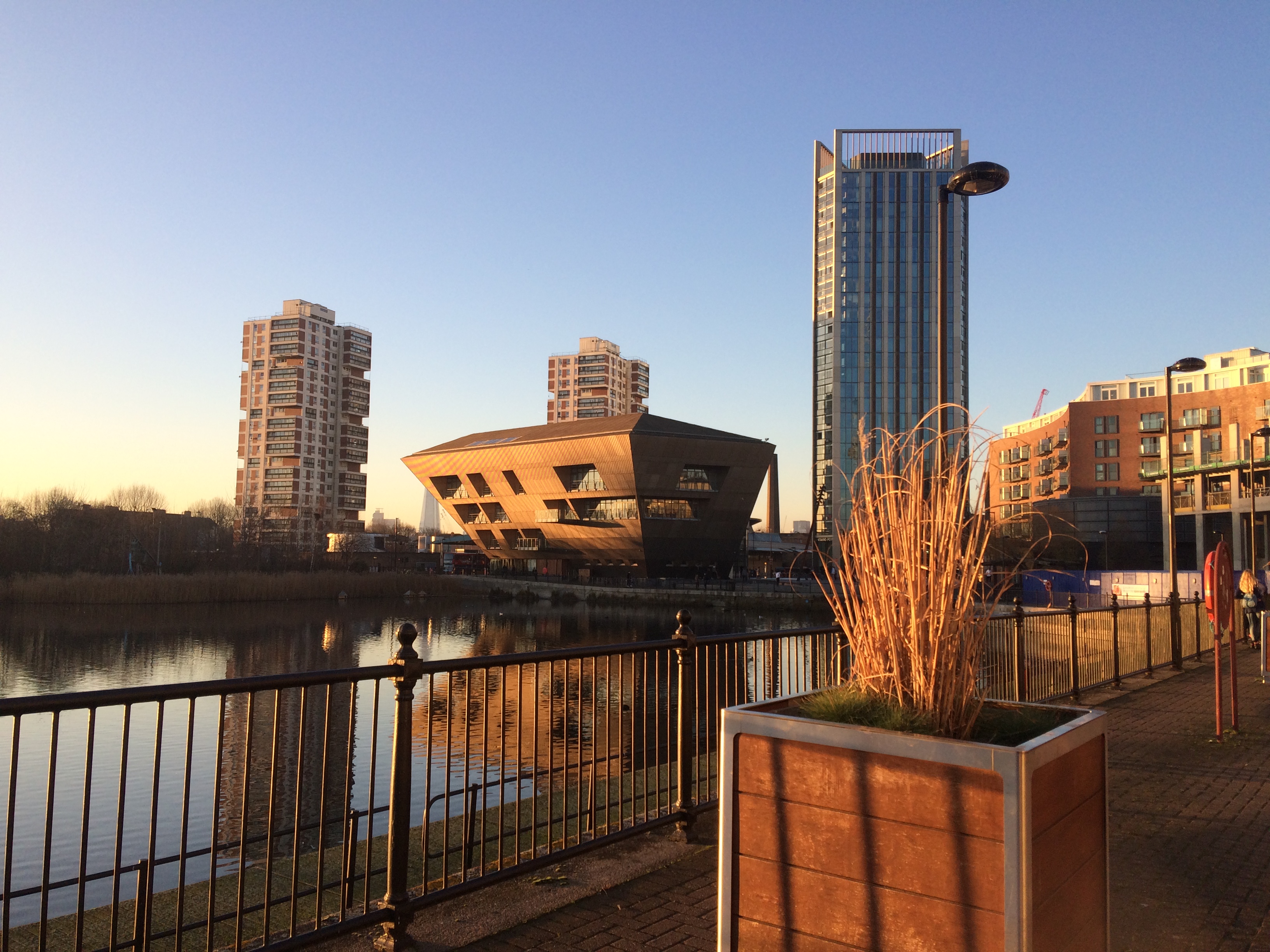 One last dock to explore ~ Canada Water (formerly Canada Dock), from which the station nearby takes its name. This is now a freshwater lake here, which has many species of birds and other wildlife taking rest from the hustle and bustle of the city outside. It was originally used as a meeting and unloading ground by ships arriving from Canada carrying timber and other goods for use in England. This incredibly striking building that the sunlight has lit up so well is Canada Water Library, which is open to the public.