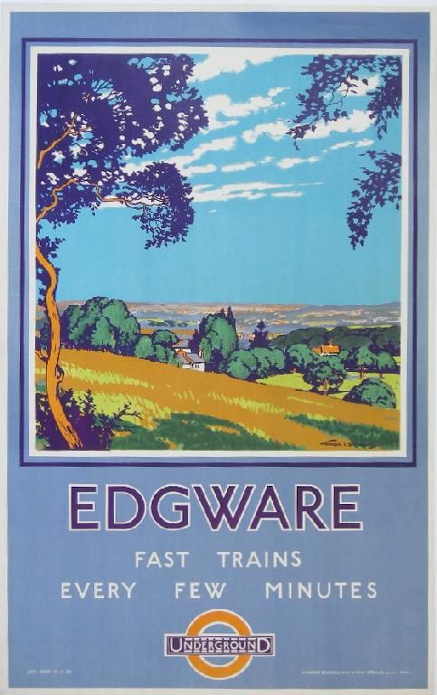 Edgware, another travel destination for early Underground posters with open green spaces, is similarly presented here as a pretty bucolic village where “country excursions” could be found.