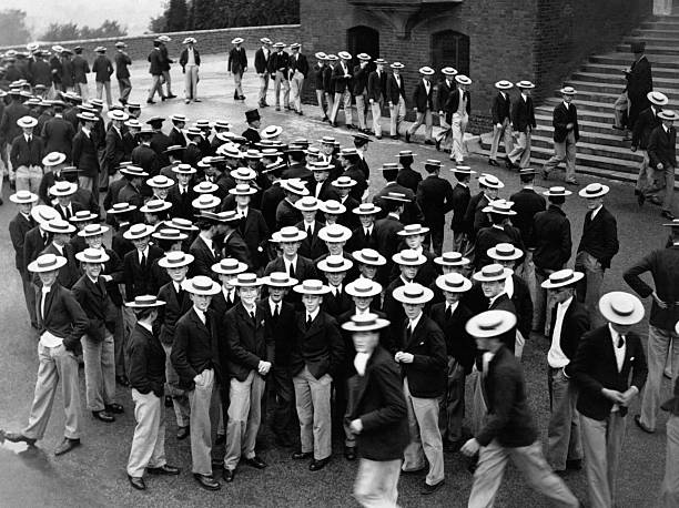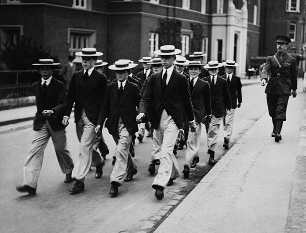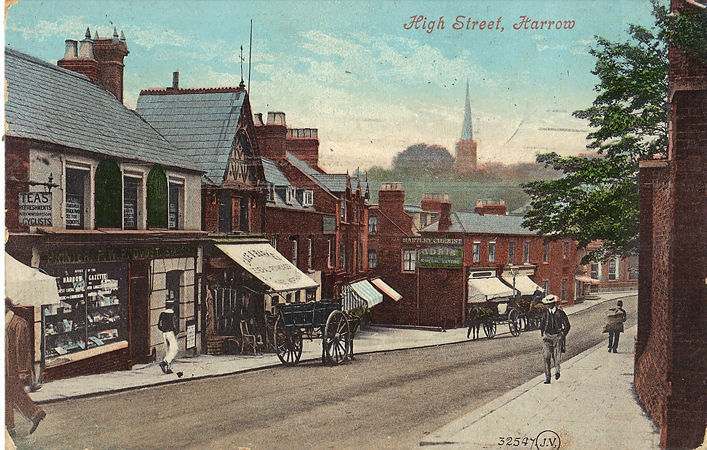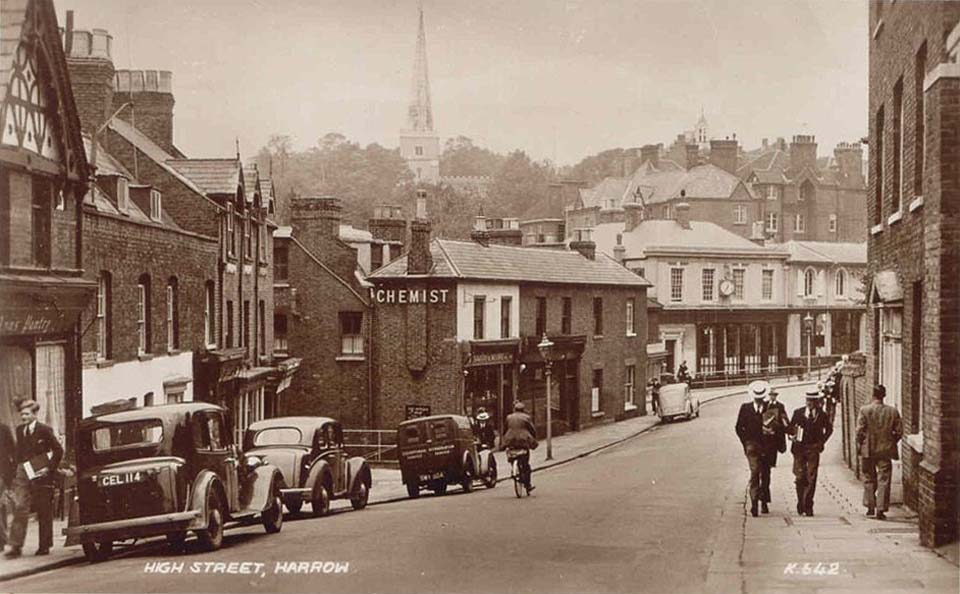 In the picture above, the characteristic white straw boaters of the famous Harrow public school can be seen on two of the boys as they march in parade up the High Street in Harrow with the church spire of Harrow-on-the-Hill in the background.