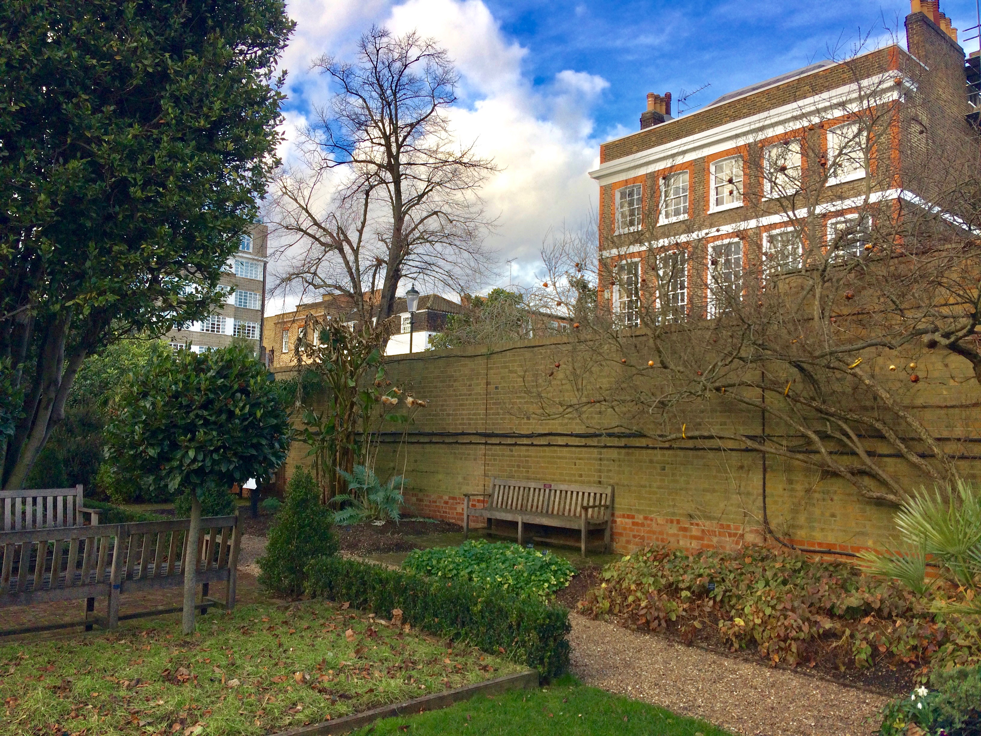 As we wander through the iron gate, an apple tree looms above, offering its crops towards the sky. It’s so quiet here, and I’m reminded that Chelsea was once a village. What a haven this once must have been ~ it still is now, especially in February when most think there isn’t much to seeโฆ Gulp in the fresh, crisp air and keep walking.