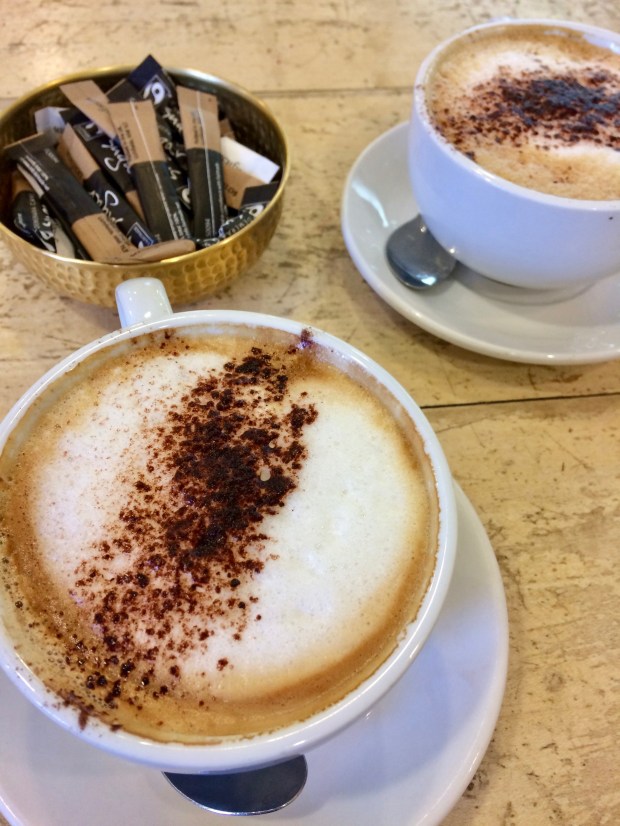 And inside the little cafรฉ they serve us two warm cappuccinos. We settle back to take in the view, the only two there.