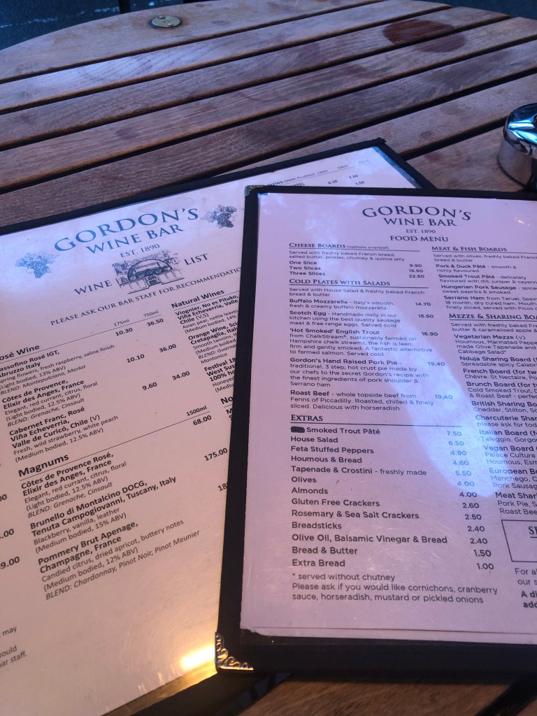 My footsteps made their way to Gordonโs Wine Bar, my father being called Gordon and knowing this restaurant from his own days in London. “I need to make a phone call,” I said to one of the waiters, “but I donโt want to disturb everyone,” gesturing to the diners along the railings. “Of course,” he said and waved me down to the far end, where I am sitting now. I can feel nerves in my stomach and my throat hurts. Nothing left to do but to call.