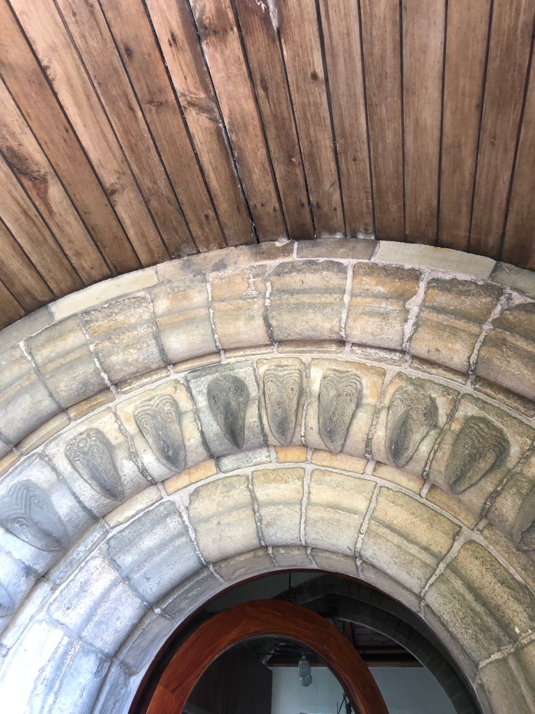 These features are Romanesque (meaning: ‘in the manner of the Romans’), used to describe the dominant architecture throughout Europe during the medieval period when the first surviving parts of this church were built. A little digging told me that the faces above the arch are correctly called ‘beakheads’, but what was a grotesque bird’s face doing carved into a church, a Christian sacred space? Today, scholars generally agree that grotesques and gargoyles were intended to ward off evil spirits and protect those inside the church. But to me, these beakheads and the unsettling figure above the porch gable were natural progressions from the fantastical figures that were very much part of pagan religion during Anglo-Saxon times before England was fully Christianised, evidence for which we found in the next church…