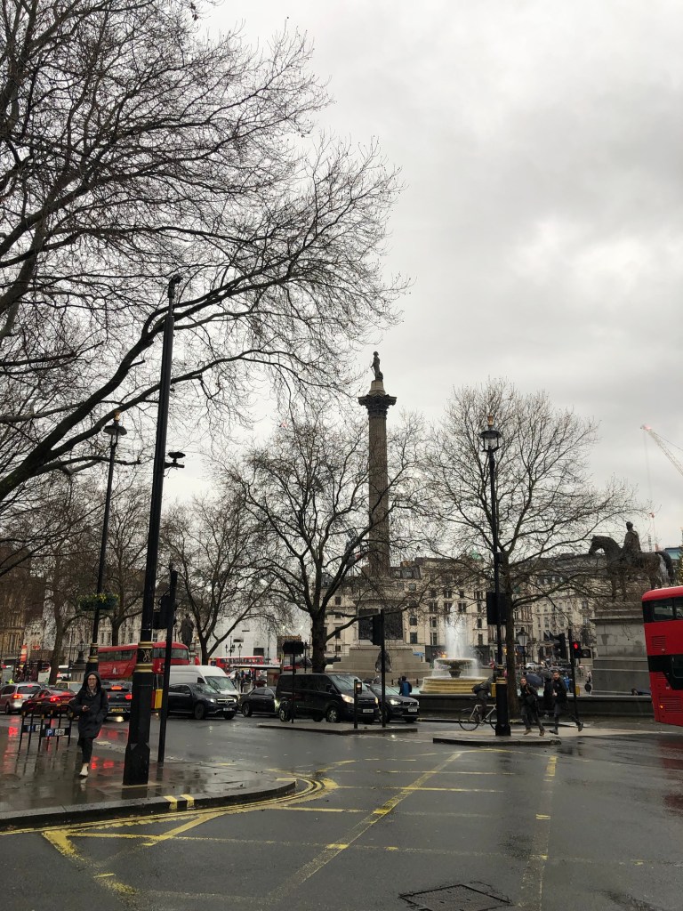 Despite my cloudy mood, footsteps felt festive, jaunty even, as though buoyed up by the Christmas lights along the railings, mulled wine and market stalls in Trafalgar Square. I could have levitated if Iโd wished, perhaps beside the statue of the lion with its back to the frosty fountain or towards Nelson on his column up thereโฆ